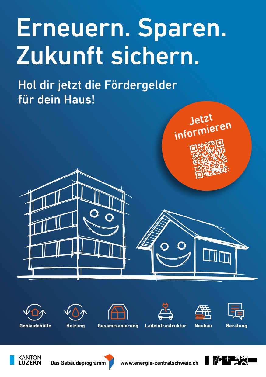 Erfreuliches für's 2026. Der Kanton Luzern führt das Förderprogramm Energie weiter, insbesondere werden Ladeinfrastrukturen für E-Fahrzeuge weiterhin gefördert. Näheres finden sie im beiliegenden Flyer.